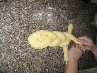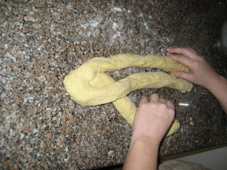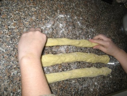 Fazer 3 rolos de massa para depois serem entrançados.
