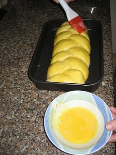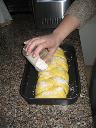 Pincelar a trança com o ovo batido e salpicar com côco ralado, que ficará agarrado ao ovo batido.