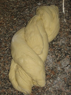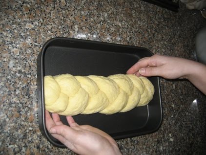 Unir as pontas só de um lado da massa e fazer a trança (depois de ter a trança feita, unir as pontas da outra extremidade e dobrar as pontas para baixo da massa, para não ficarem à vista) e transportar para um tabuleiro untado que possa ir ao forno.