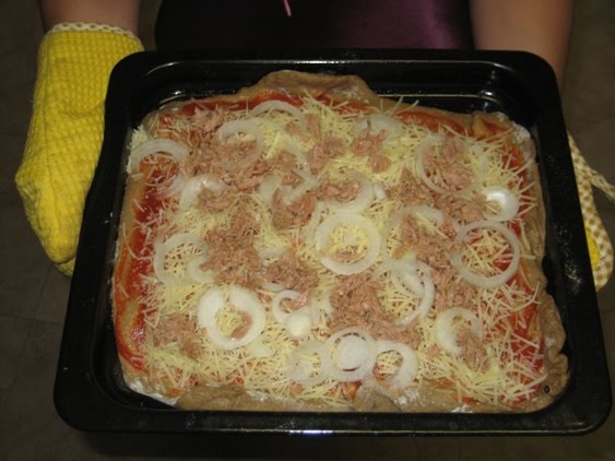Depois é só colocar os ingredientes que mais gostar ( por exemplo, colocar em cima polpa de tomate, depois queijo ralado e por cima atum, cebola, orégãos, etc.)