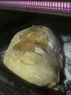 5. Deixe levedar num local abrigado de correntes de ar (eu coloco dentro do forno a 50ºC, para ajudar a fermentar) durante 1h ou até a massa duplicar de tamanho.